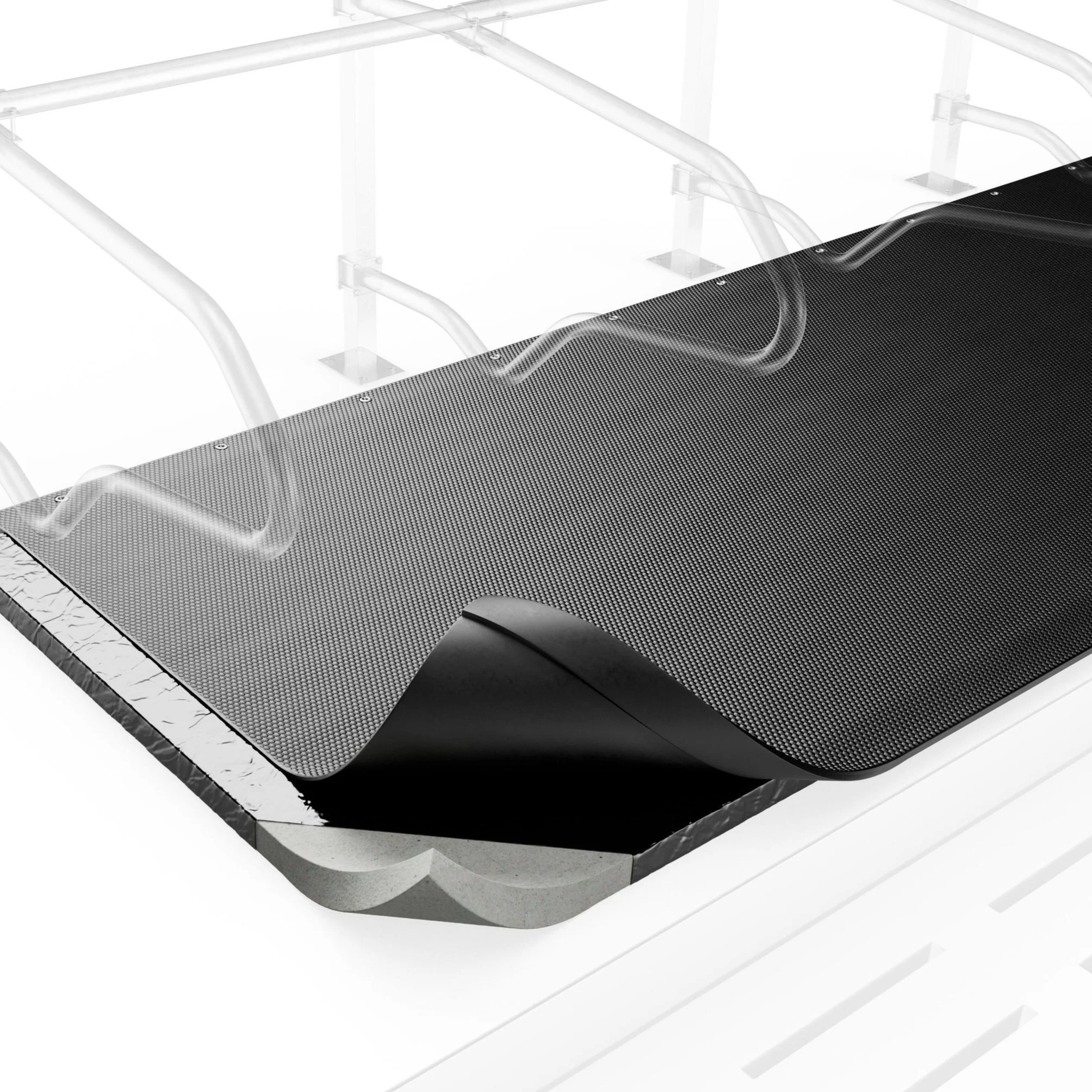 Top cover comes in 80ft length to decrease joins and with a ‘sealing strip’ on front and back to help seal out liquids. This also provides a strong anchor point.